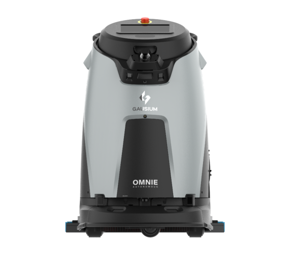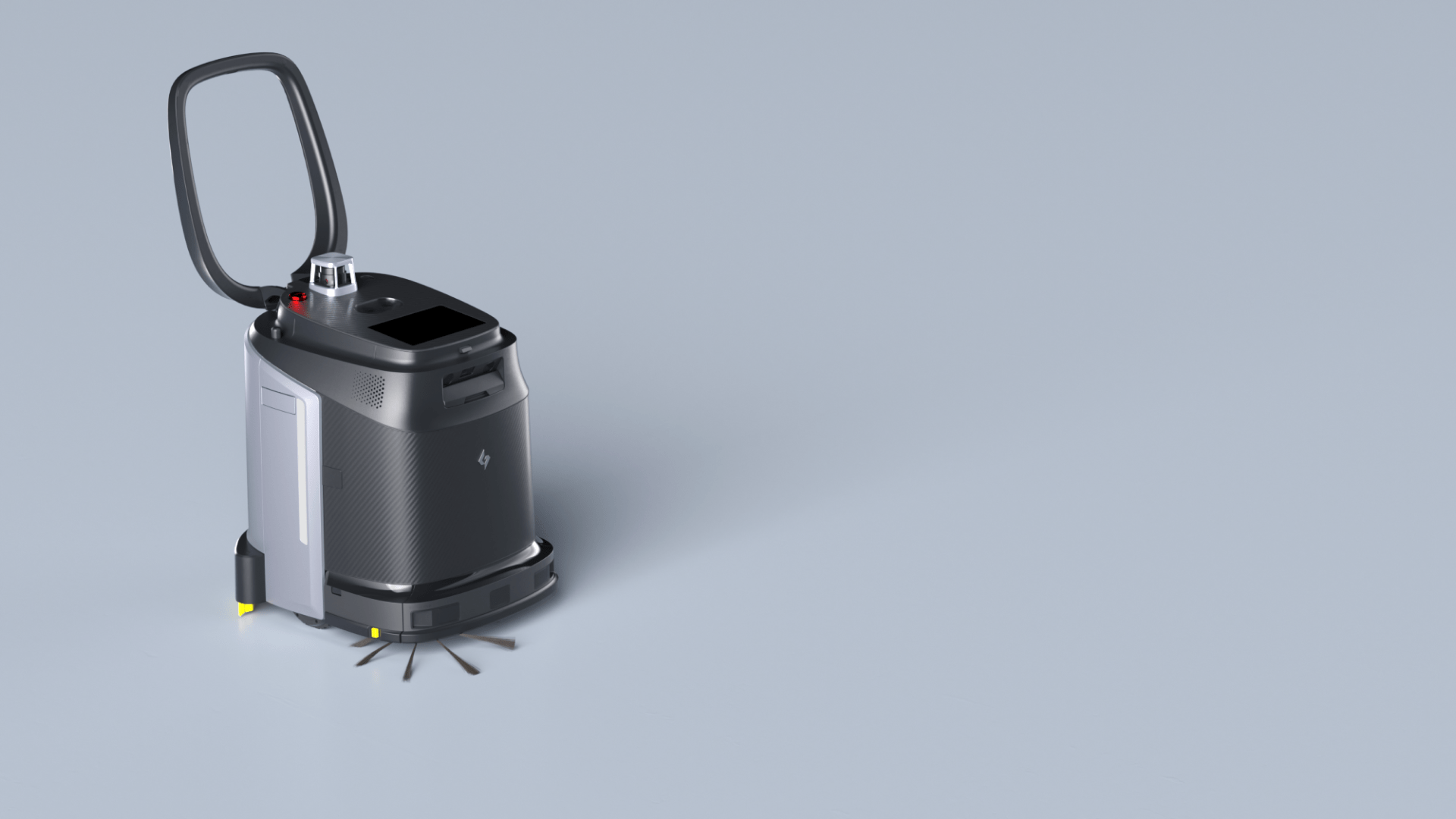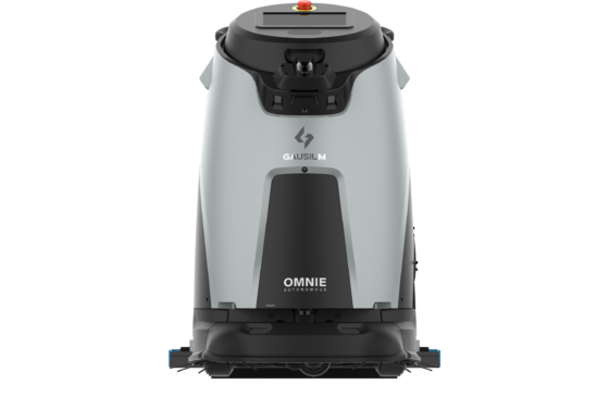 Compact commercial cleaning robot combining Vacuuming, Sweeping, Scrubbing, and Dust Mopping in one unit.